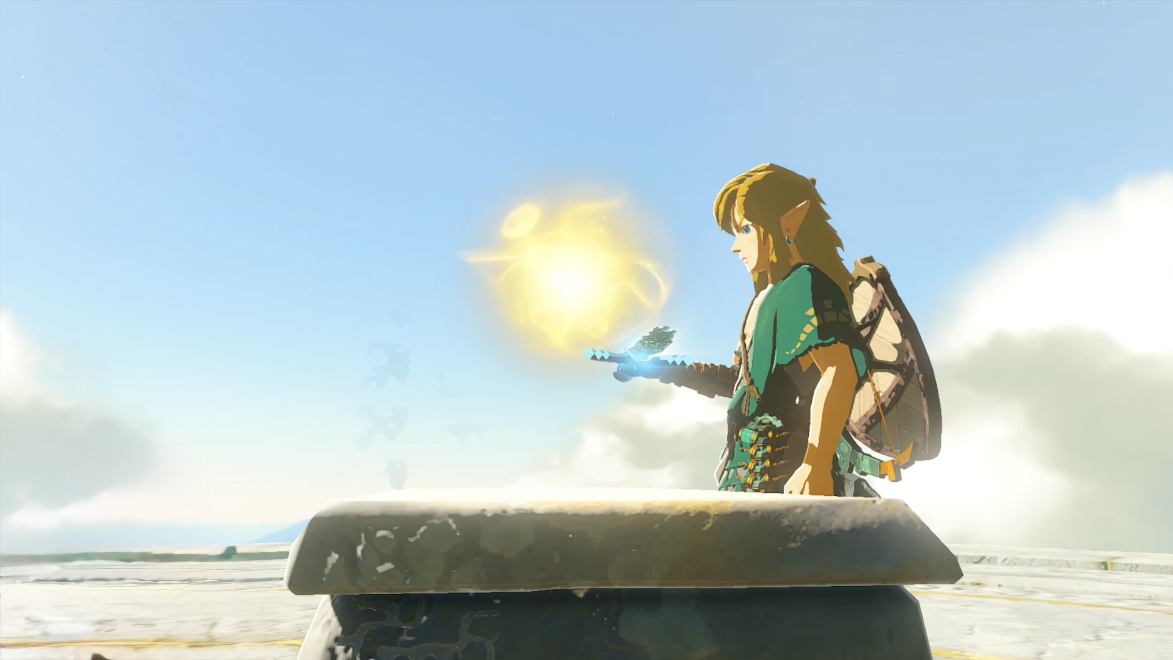 Nachdem Link aus den Katakomben gerettet wurde, findet er sich schwer verletzt auf einer schwebenden Insel wieder, einer der Himmelsinseln, hoch über Hyrule. Sein rechter Arm war vom Miasma verletzt und nutzlos, doch eine geheimnisvolle, leuchtende Hand ersetzt ihn: Sie stammt von Rauru, dem ersten König von Hyrule. Diese Hand rettete nicht nur sein Leben, sondern übertrug auch eine unbekannte Macht auf ihn.